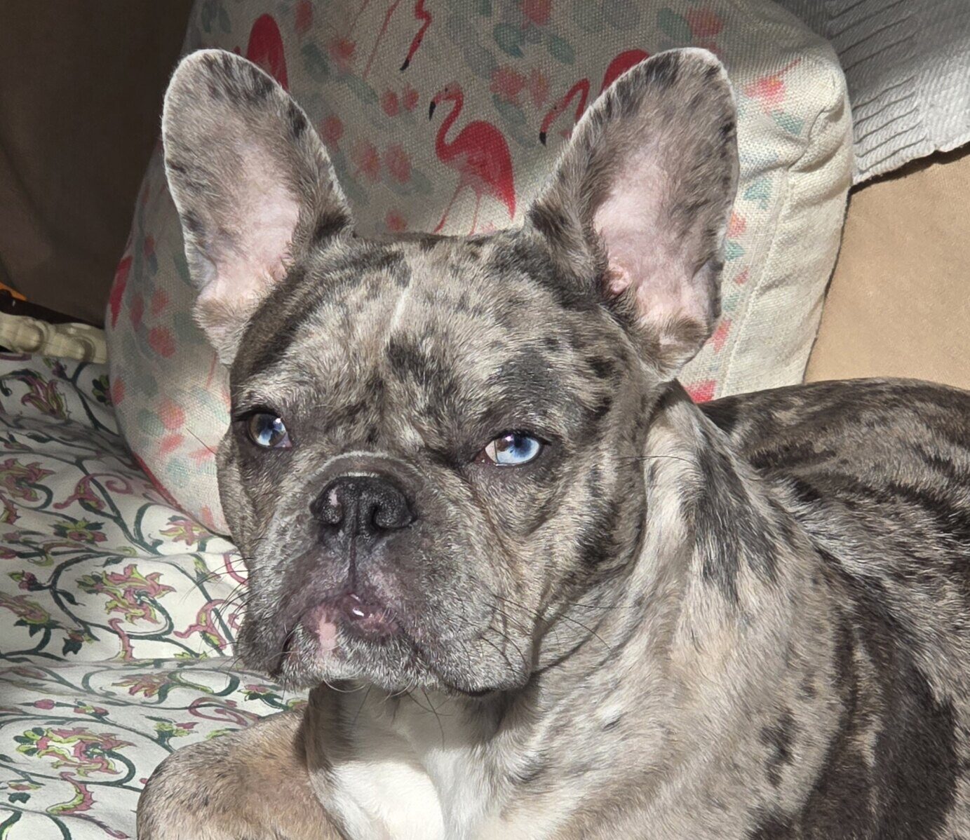 : es una bulldog francés blue merle de exelente carácter, le gusta mucho la gente y sobre todo los niños. Sabe sentarse a la orden dar la pata y chocar los 5 .